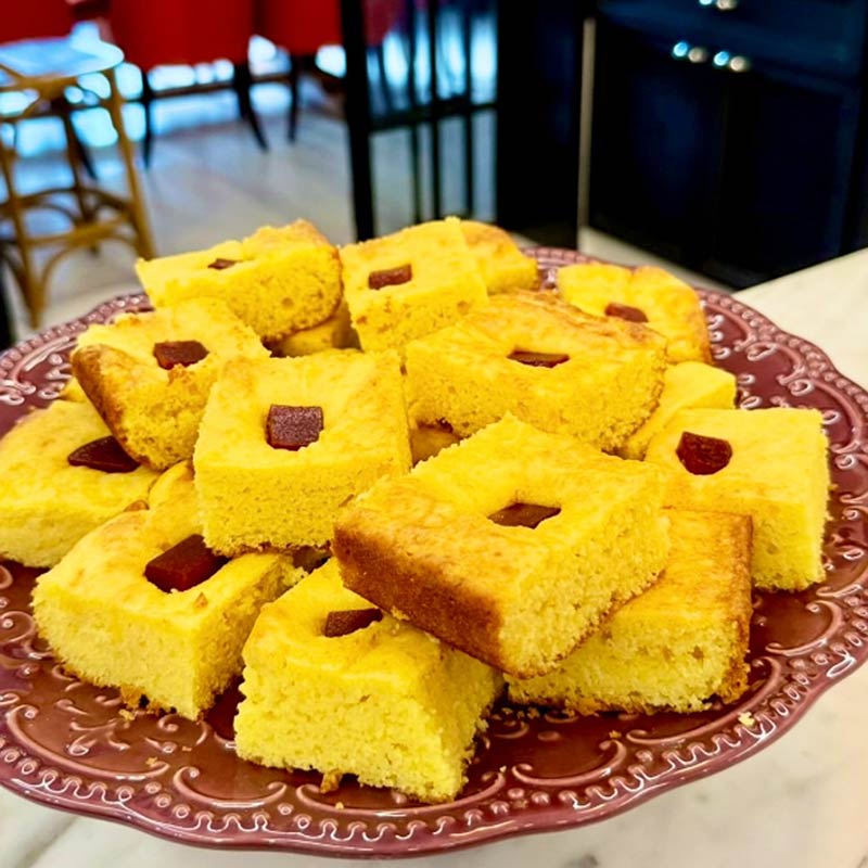 🔹 Colocar a massa do bolo na assadeira untada e enfarinhada e distribuir os cubos de goiabada por cima da massa.