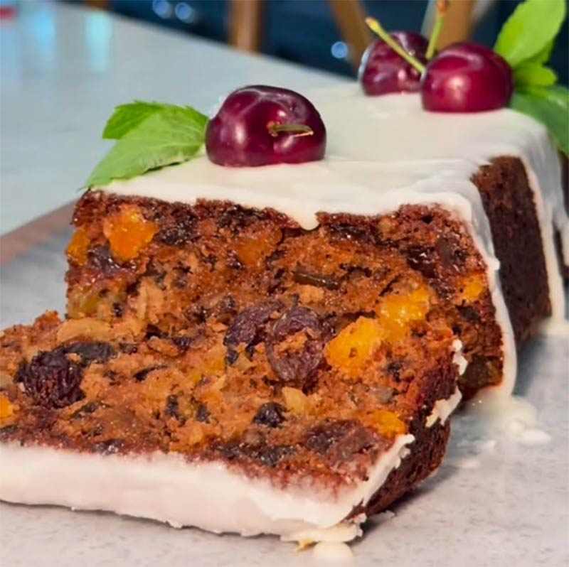 🔹 Misturar com uma colher os ingredientes da cobertura e cobrir o bolo frio, deixando cair um pouco nas laterais. Decorar com frutas secas ou com cerejas frescas.