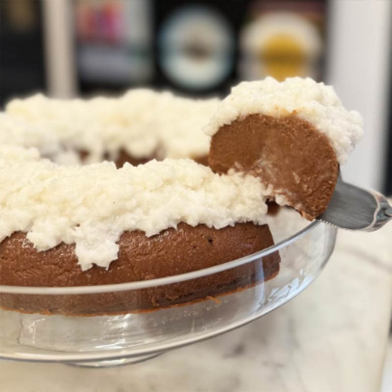 🔹 Desenformar o brigadeirão e colocar a cobertura de coco por cima.
