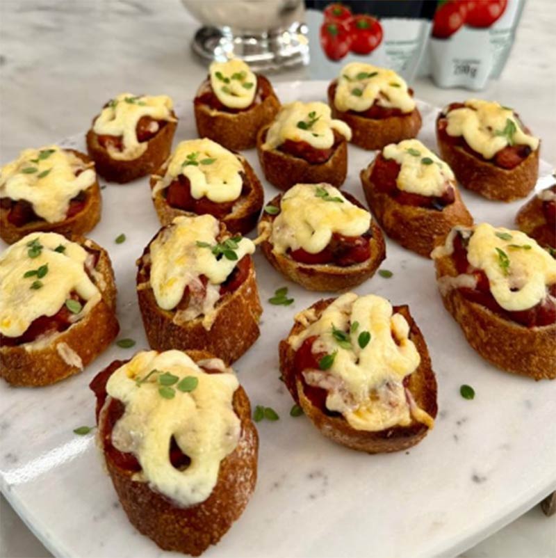 🔹 Retirar o pão do forno, esfregar um dente de alho na parte mais dourada do pão, distribuir um pouco do recheio de beringela em cada fatia e ir voltando as fatias para assadeira. Colocar uma colher de catupiry por cima de cada fatia e polvilhar todas com parmesão.