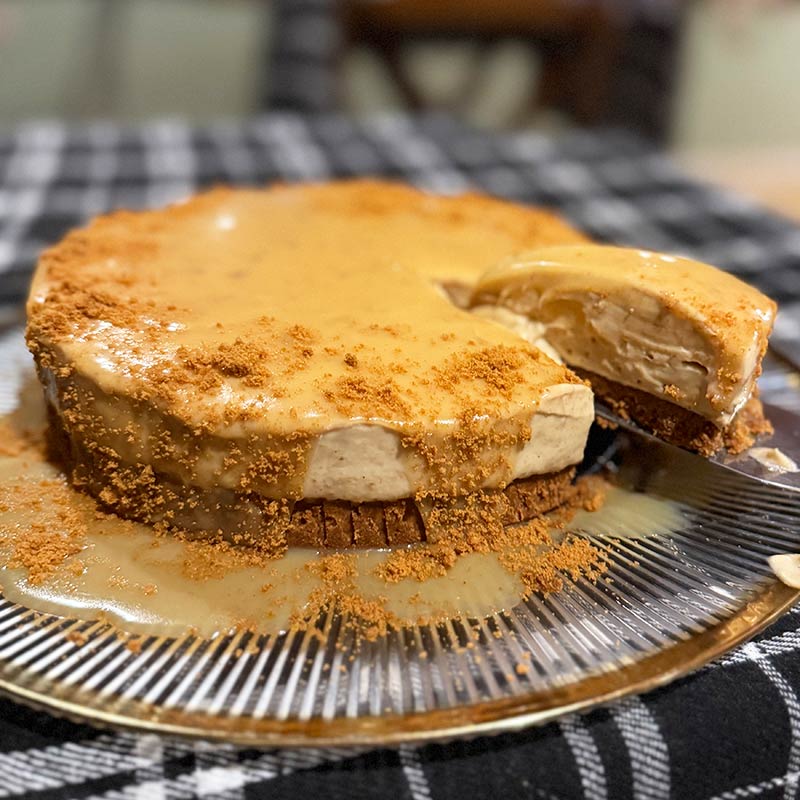 🔹 Transferir o cheesecake para o prato de servir, passar uma faca ao redor para ficar bem liso, regar com a calda preparada e polvilhar a toda volta com o biscoito biscoff moído.
