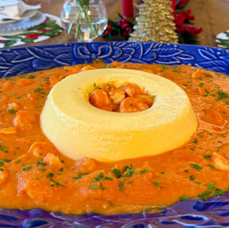 🔹 Passar uma faca em volta do pudim e desenformar na travessa que vai servir. Colocar o molho com os camarões em volta do pudim, polvilhar com salsinha picada e servir.