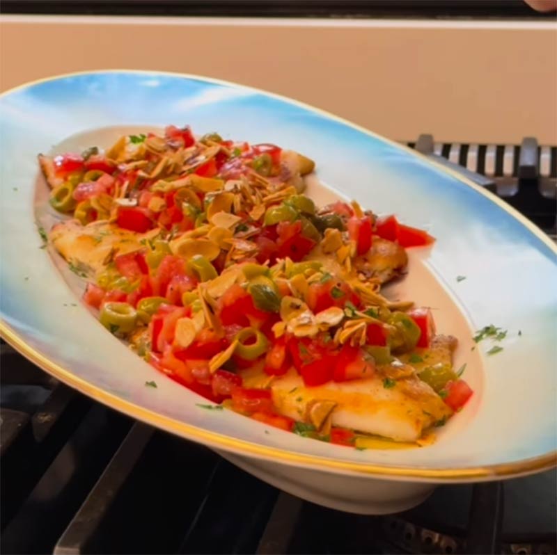 🔹 Cobrir o peixe com o molho e polvilhar de salsinha picada e raspas de limão e cobrir com com as amendoas. Servir imediatamente.