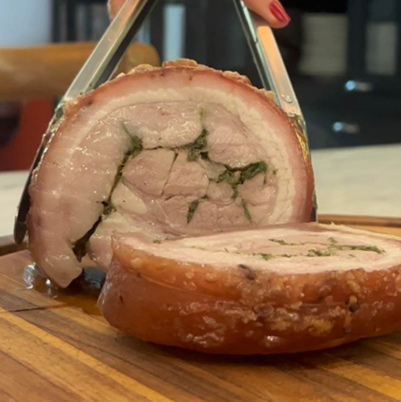 PORCHETTA recheada com ervas e limão siciliano acompanhado de arroz de brócolis