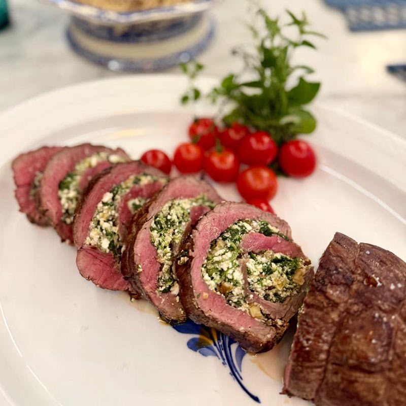🔹 Enrolar a carne como um rocambole e amarrar com barbante toda a carne.
