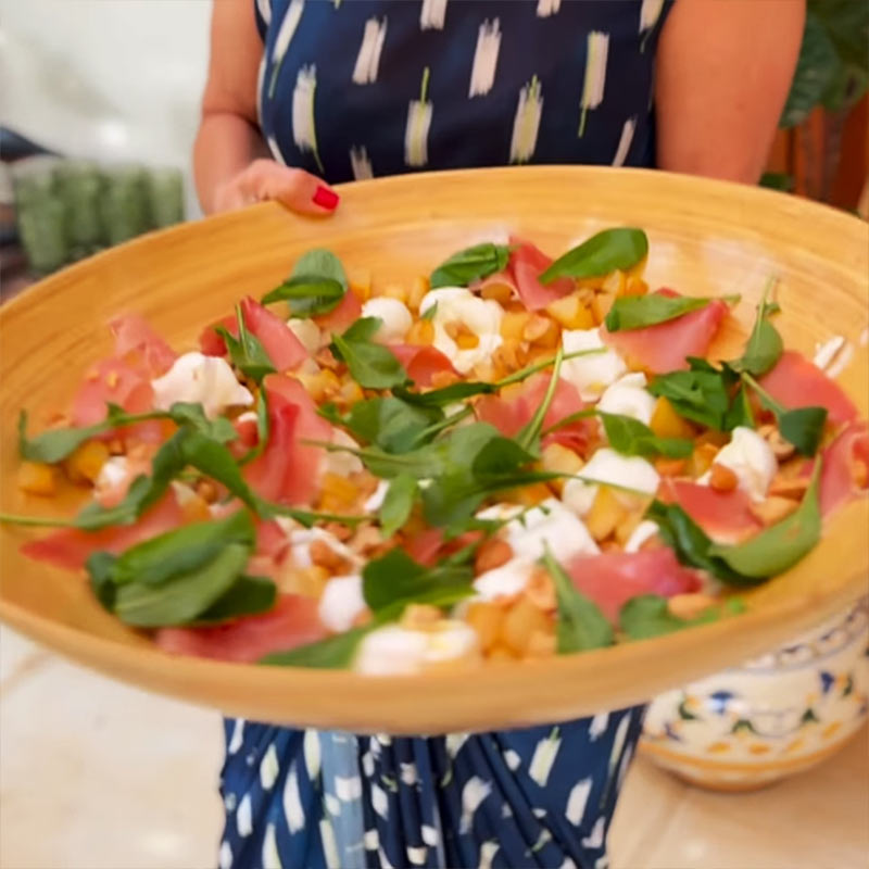 🔹 Colocar as folhas de rúcula por cima e distribuir pedaços de presunto cru por todo prato.