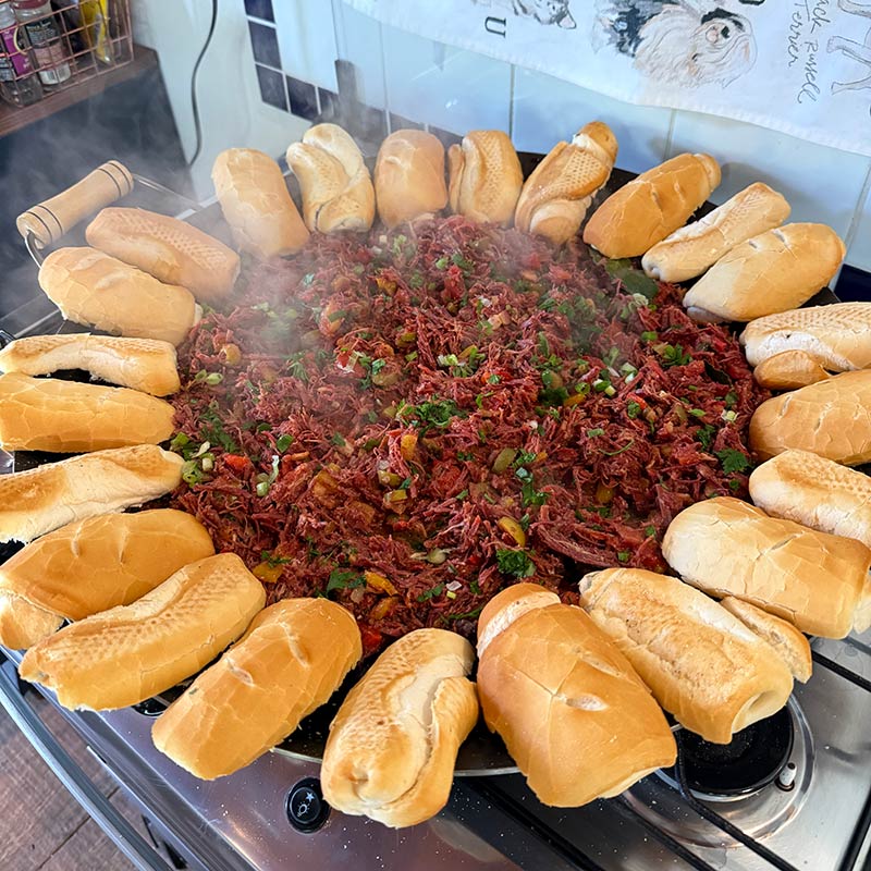 🔹 Colocar a carne seca já cozida e desfiada e mexer. Regar com 3 colheres de azeite. Puxar a carne para a lateral da panela e colocar no centro os pimentões em cubos, tomates cortados em cubos sem sementes, azeitonas em rodelas, pimenta dedo de moça picadinha e temperar com a passata, molho inglês, 2 folhas de louro, regar tudo com a cerveja e cozinhar mais 5 minutos.