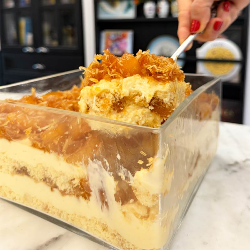 ➡️ Colocar uma camada de bolo esmigalhado e regar com a calda. Cobrir com creme e colocar o doce de abacaxi por cima do creme. Repetir: bolo, molhar com calda, creme, abacaxi e bolo por cima.