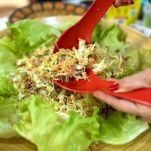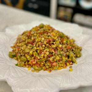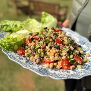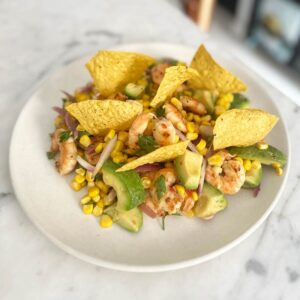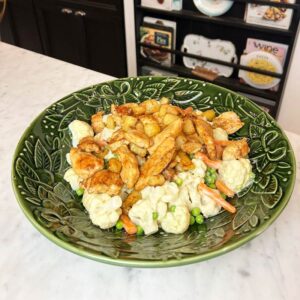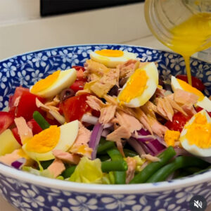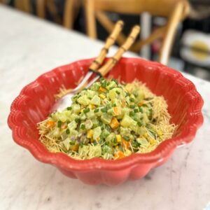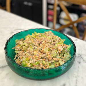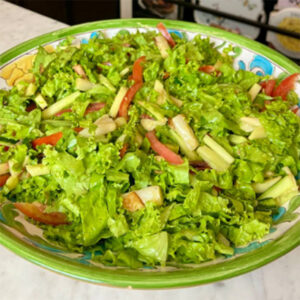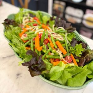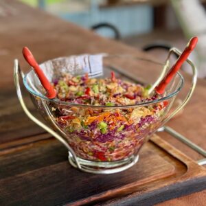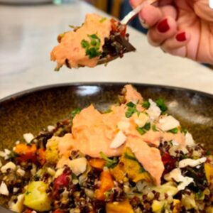 Salada de legumes com frango e abacaxi grelhados e molho especial